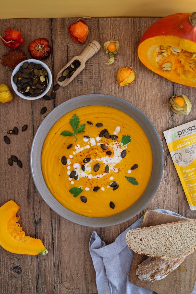 Zunächst Hokkaido Kürbis entkernen und mit Karotten sowie Zwiebeln in kleine Würfel schneiden. Ingwer und Knoblauch fein hacken. Kokosöl in einem Topf erhitzen, Zwiebeln glasig anbraten, Ingwer sowie Knoblauch dazugeben und einige Minuten mit anbraten.