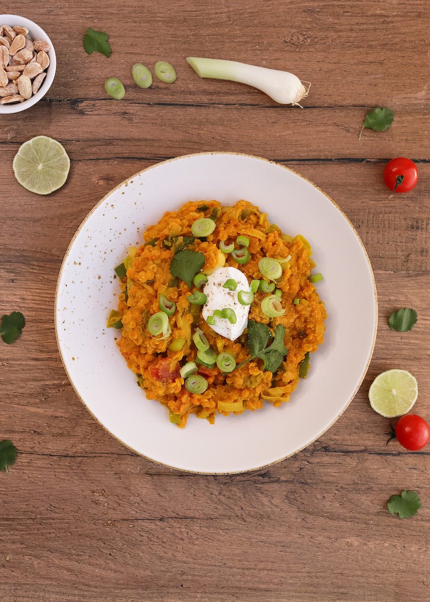 Nun alles mit Gemüsebrühe, Kokosmilch und passierten Tomaten ablöschen. Dann das Veprosa gelbes Curry in den Linseneintopf einrühren und alles für 10min köcheln.