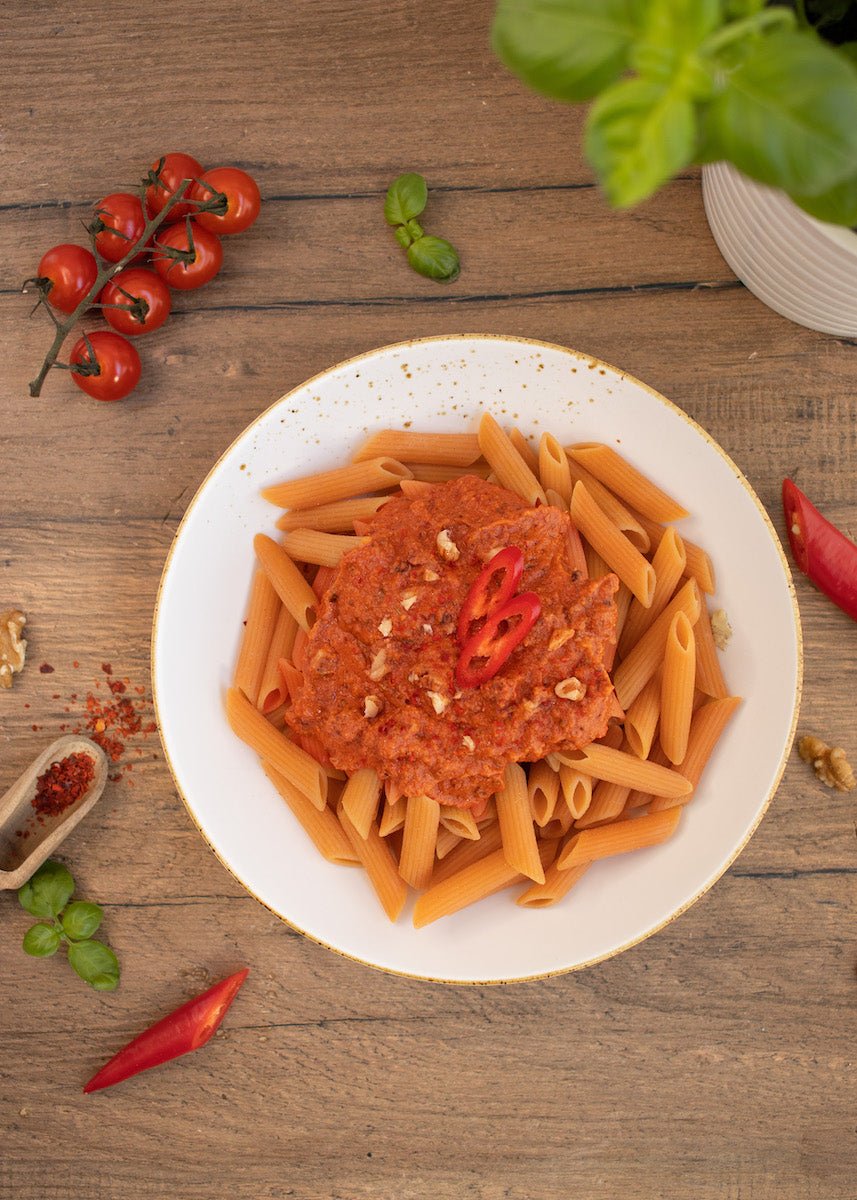 Walnüsse hacken und unter das Pesto heben. Nach Belieben mit Chiliflocken verfeinern und zu der Penne servieren!