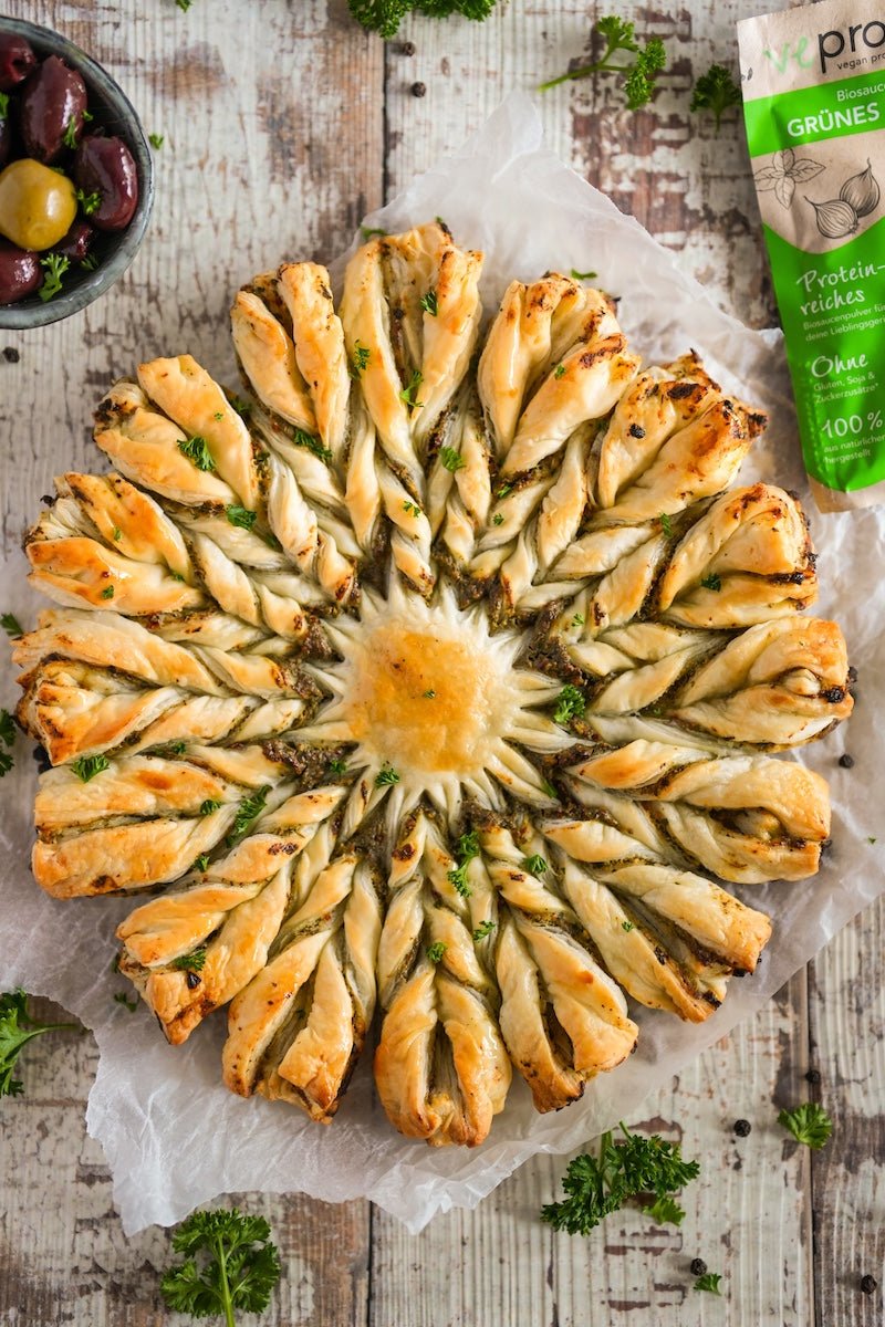 Die Käsealternative (falls nicht gerieben) fein reiben. Nun einen Blätterteig auf ein mit Backpapier belegtes Backblech geben und mit Füllung bestreichen, Käsealternative darauf verteilen, den zweiten Teig darauf geben und ganz leicht andrücken.Dann ein Glas in die Mitte legen und 12 oder 24 Mal bis zum Rand in gleichmäßigen Abständen durchschneiden.Jeweils die nebeneinanderliegenden Stränge in entgegengesetzter Richtung nach außen drehen und am Ende zusammendrücken.