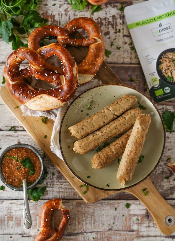 Nach dem Dämpfen die Würste kurz ausdampfen lassen. Sie können dann klassisch zu Brezeln und süßem Senf serviert werden. Wir lieben sie aber auch als proteinreichen Snack für unterwegs. Die herzhafte Alternative zu Proteinriegeln.